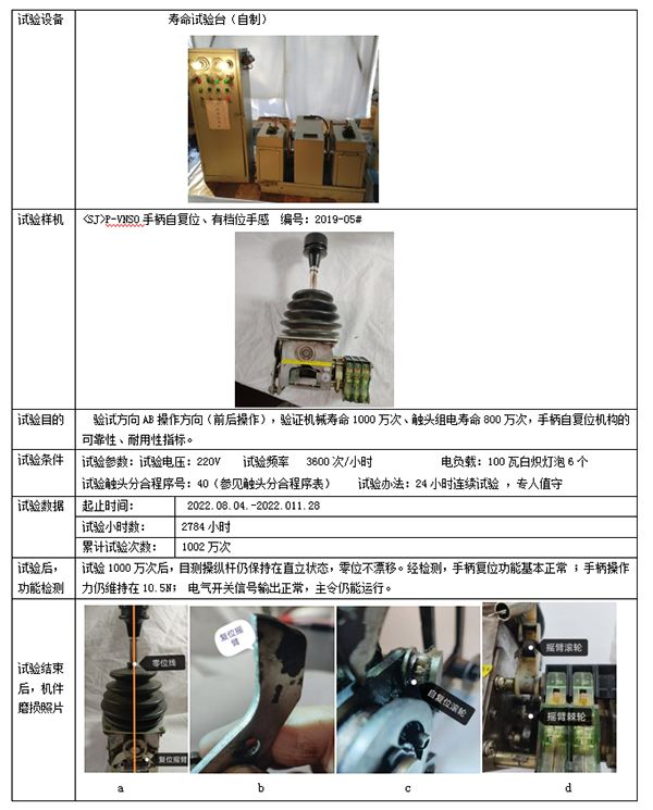 2019年一季度,有檔位手感、帶手柄自復位的蕞有代表性的第 一輪基礎樣機被研發出來。并對其機械壽命、電壽命進行了250萬次的初期試驗(試驗頻率3600次/小時),試驗中未發現大的質量問題。