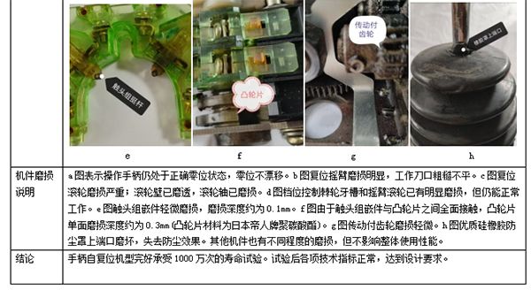 第三個優點,復位杠桿上我們設計了多個拉簧掛鉤槽,新機出廠時,我們將拉簧掛在下部槽上。隨著主令被使用3-4年以后,復位機件各處會出現明顯的機件損,零件間隙加大,拉簧的有效復位動能會降低,但仍能復位。如果此時將拉簧掛鉤上移一檔。復位功能恢復如初。本創新復位機構復位功能強大、可靠。臺架試驗表面,主令在運行1000萬次后,機件都磨損相當嚴重,但復位機構仍能工作。
